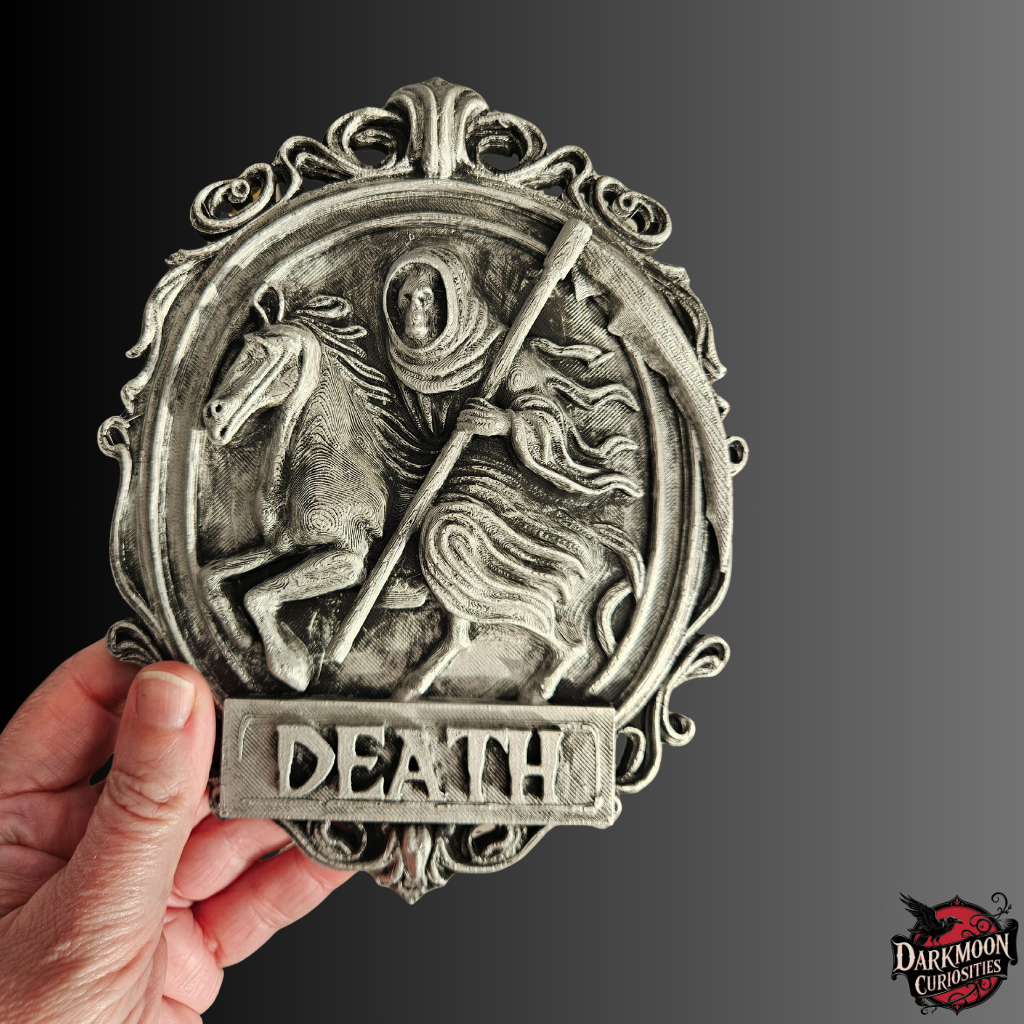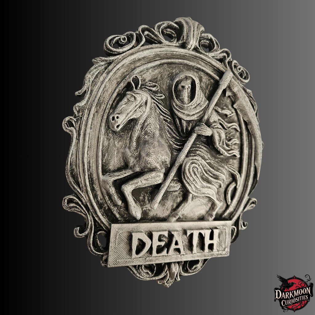 Design: Death Tarot card motif, intricately detailed and full of gothic symbolism