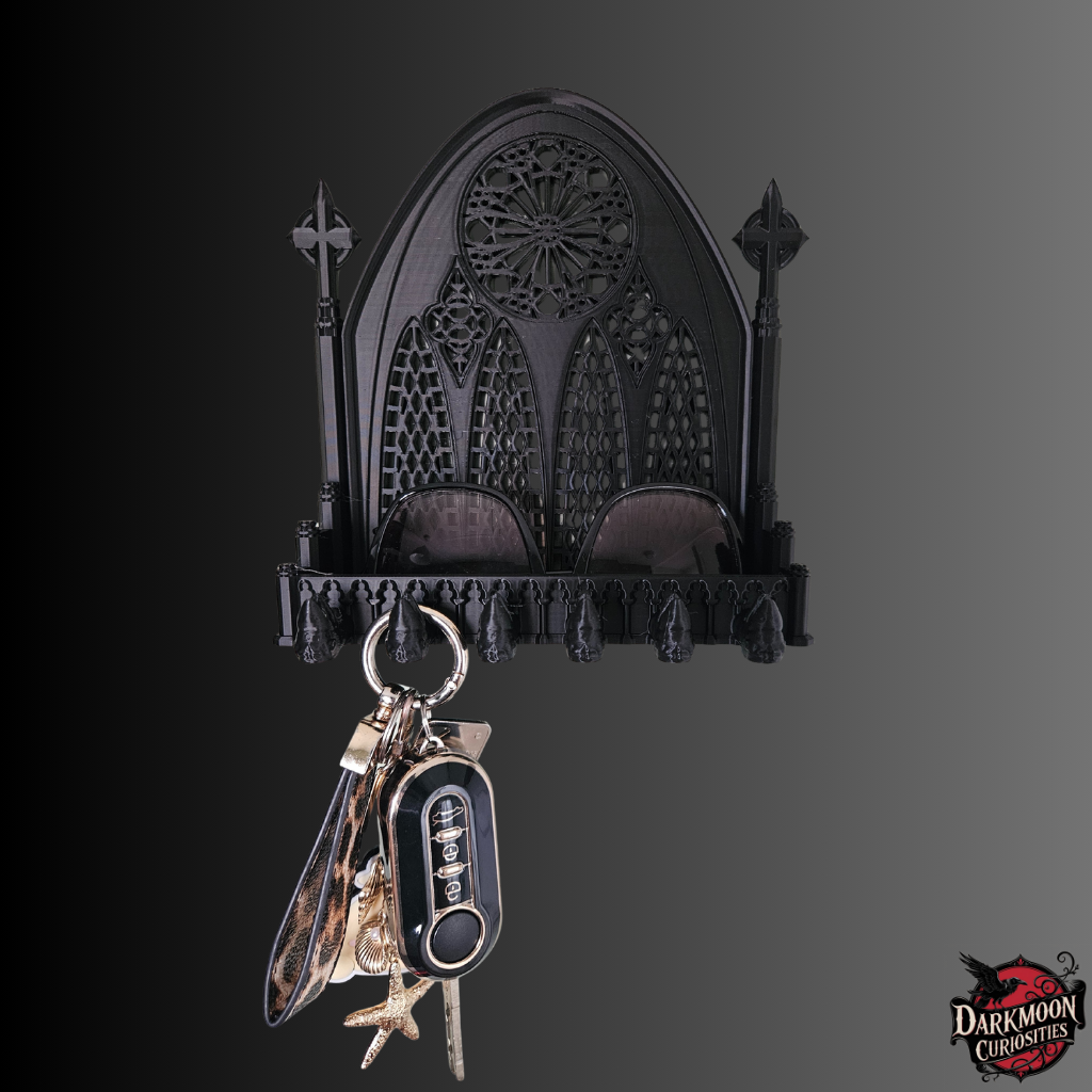 Add a dark, enchanting touch to your entryway or wall with this Gothic Cathedral Key Hanger featuring perched ravens. Designed with intricate gothic architecture and detailed ravens sitting on each hook, this key holder is perfect for keeping your keys, jewelry, or small items organized in true spooky style.
