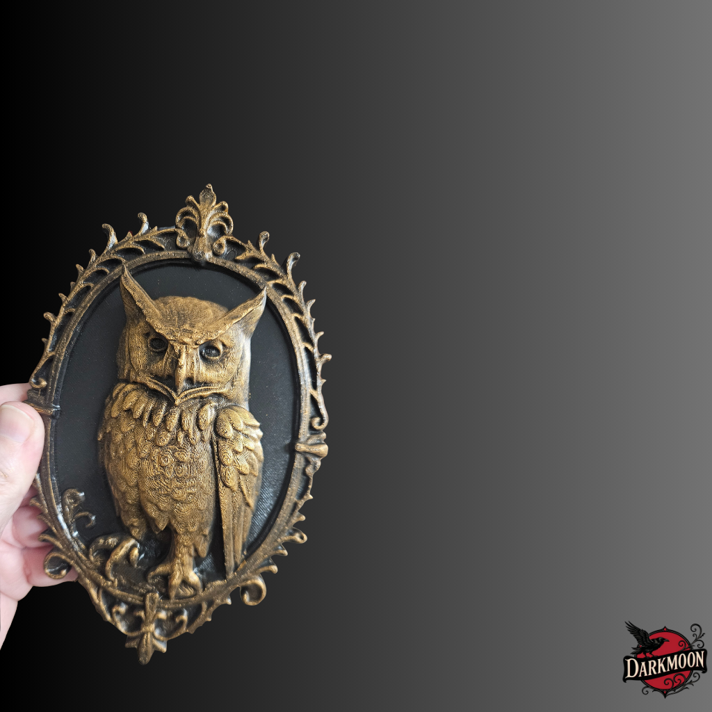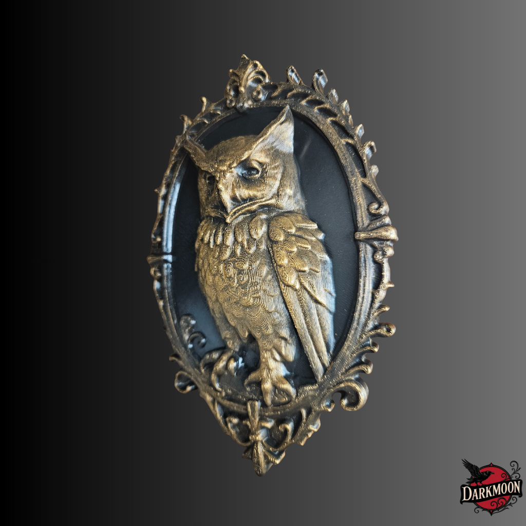This Gothic owl wall decor piece brings a dramatic antique-brass look to any room without the weight of real metal. Each owl is 3D printed, then carefully hand painted in a brass finish and sealed with varnish for durability. Hanging holes on the back make it easy to display.