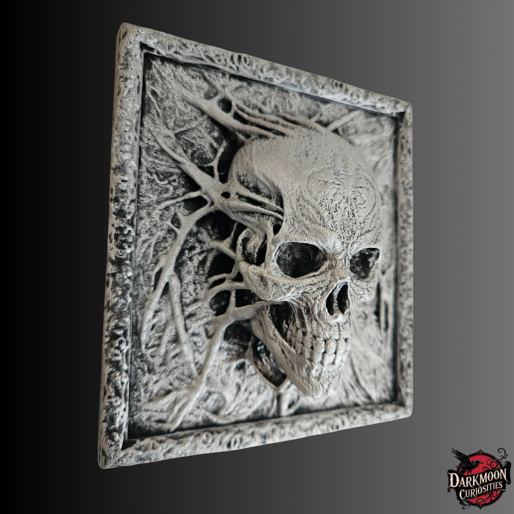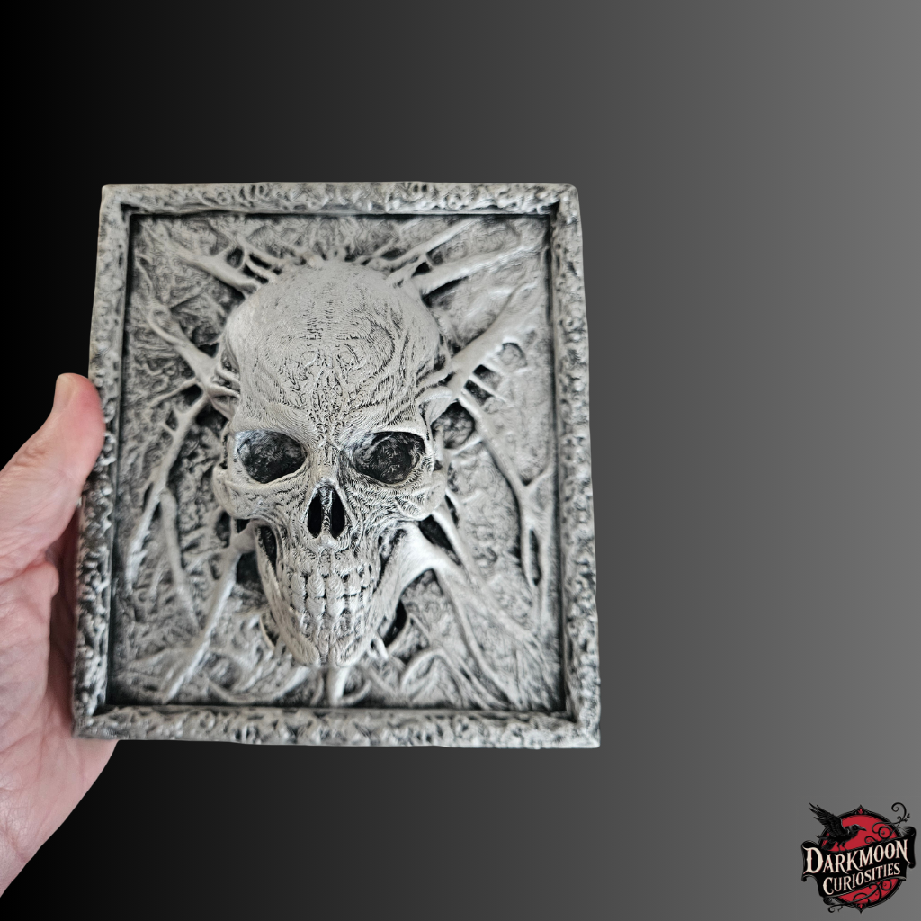 Its intricate detailing and eerie aesthetic create a captivating focal point for walls, shelves, or altar spaces. Ideal for collectors of gothic art, lovers of the macabre, or those seeking unique décor with a dark twist.