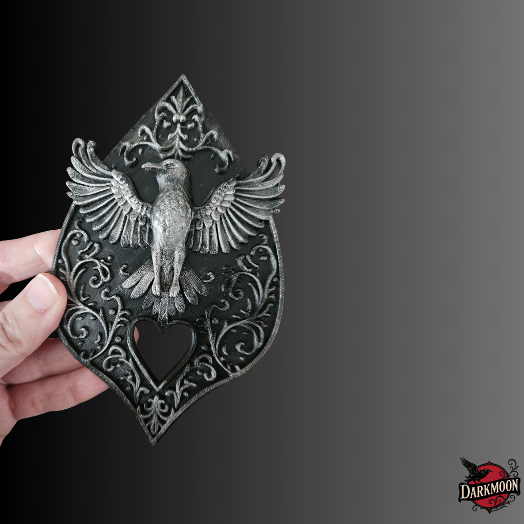The Raven’s Embrace Wall Hanging Planchette brings a touch of gothic elegance to any room. Shaped like a classic planchette and detailed with a perched raven motif, each piece is hand painted in silver for a smooth, metallic looking finish.